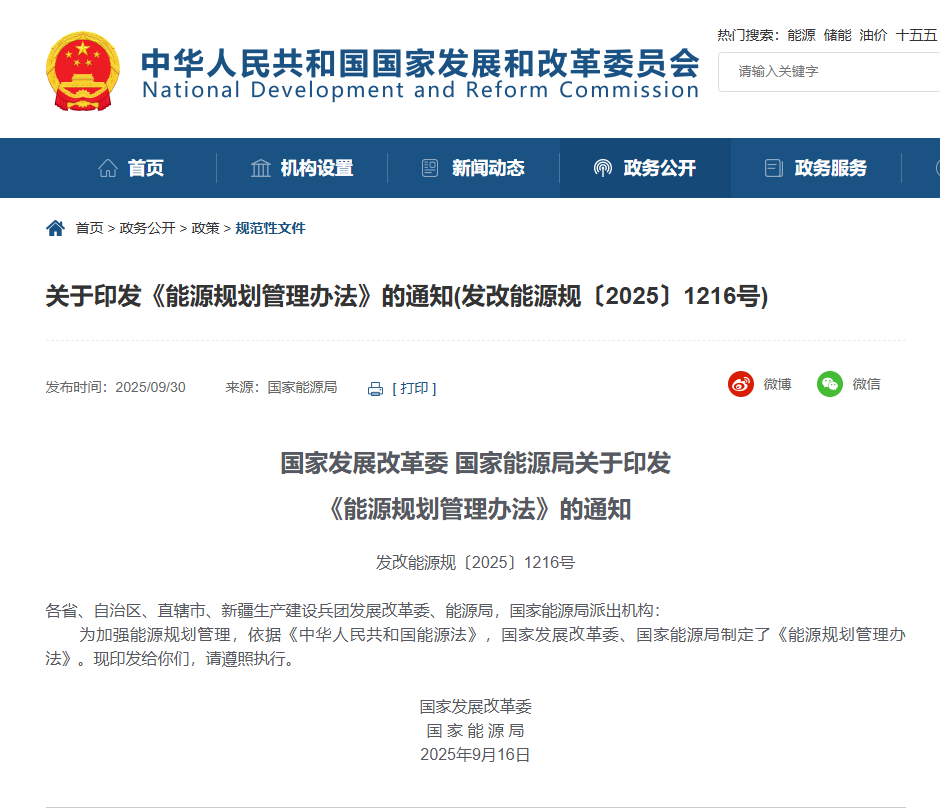 9月30日,国家发展改革委、国家能源局发布关于印发《能源规划管理办法》的通知。
