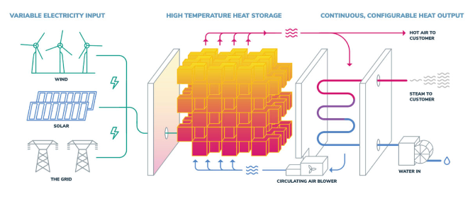 该项目采用Rondo Energy创新研发的热电池储热技术——以耐火砖为储热介质仅由“砖块和电线”构成。这些经过特殊处理的耐火砖,通过电阻加热可将温度提升至1000℃以上,实现超过97%的往返效率。热电池在电价最低的6小时内充电,可利用离网光伏或电网电力,从而大幅降低运行成本。