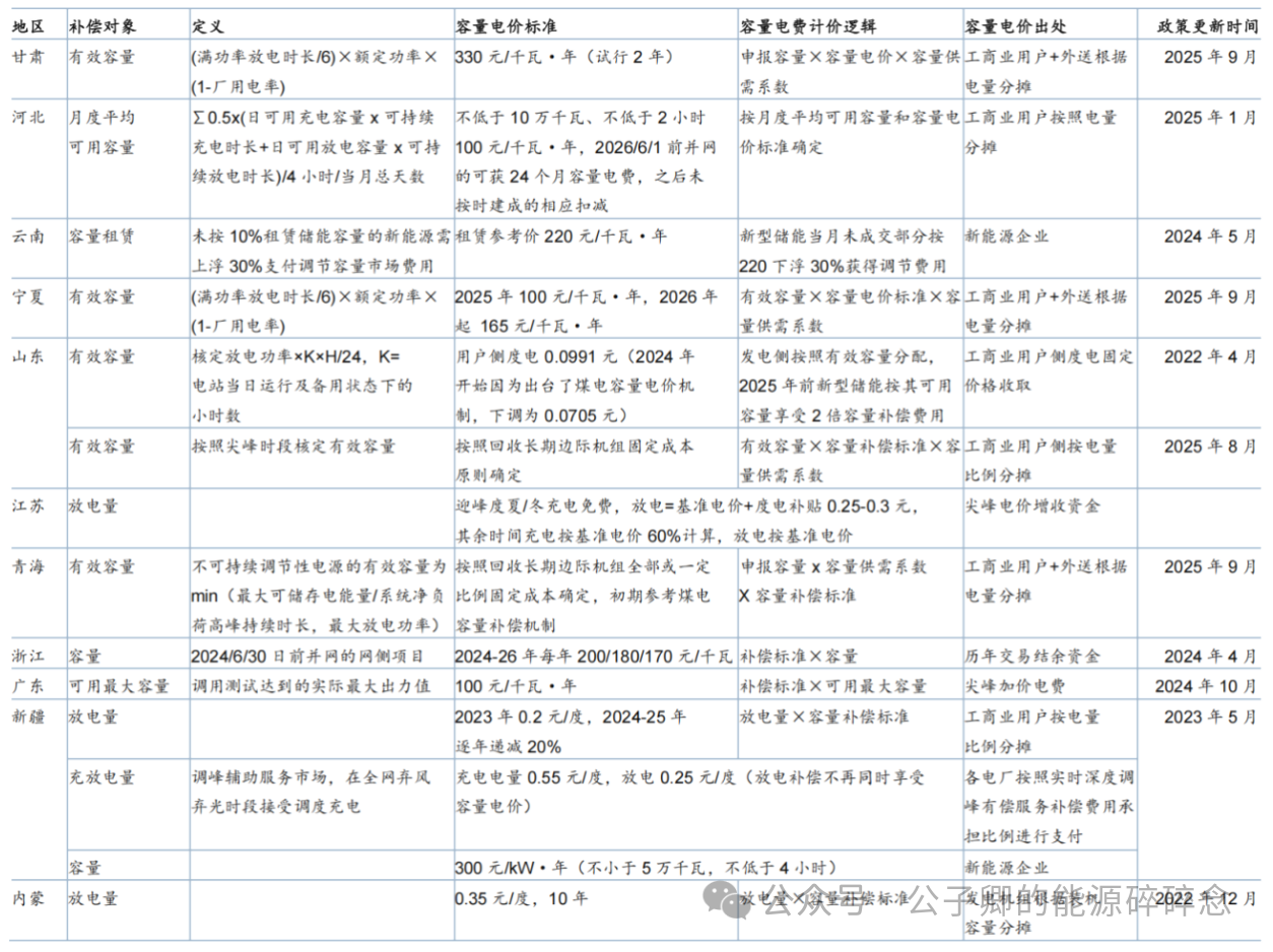 其实山东在 2025 年 8 月印发的《山东省新能源上网电价市场化改革实施方案》中也提及了优化发电侧容量补偿机制。根据山东电网用电负荷(含备用容量)总需求,对各类型市场化机组的有效容量给予补偿。按照全网回收长期边际机组固定成本原则确定容量补偿标准,依据系统总容量需求与总有效容量,设置容量供需系数。发电机组容量电费由机组可提供的有效容量、容量补偿电价标准以及当年容量供需系数三者乘积确定——上述省份关于容量电价机制的算法原则上高度类似,但是具体计算细则考虑该省实际情况会有不同。