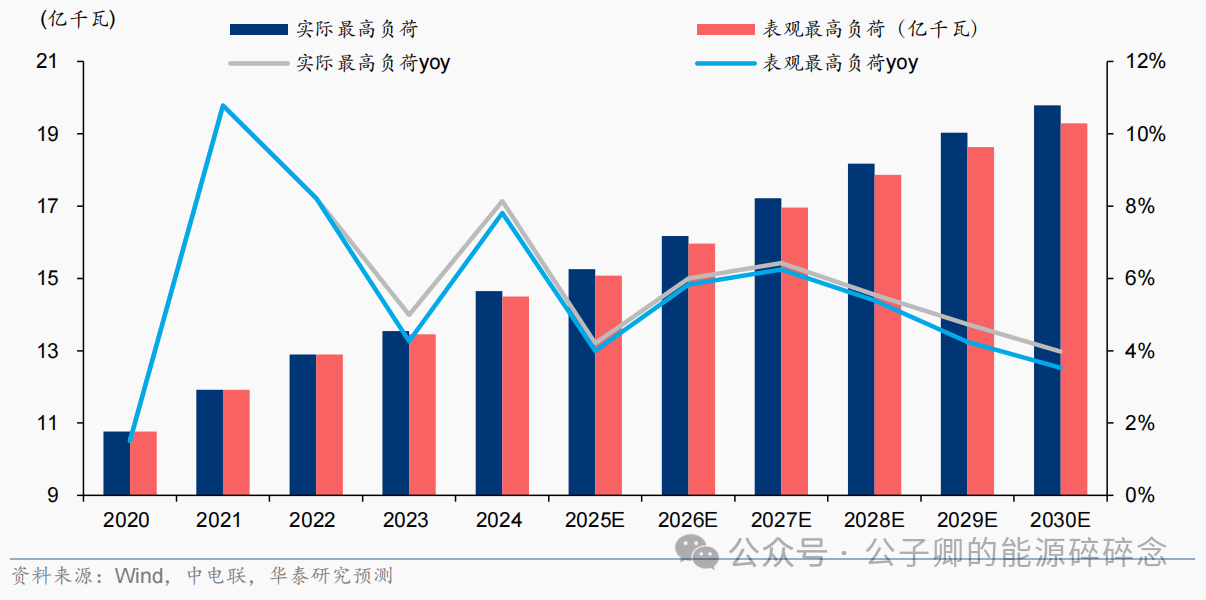 通常意义上理解为支撑电力系统的最高负荷。根据华泰证券在2024年8月的报告《公用事业/电力设备:客观看待电力缺口与过剩并存》中总结的,全球变暖背景下天气变化将呈现两极化的趋势,即“夏季更热,冬季更冷”。据人民网报道,我国夏季降温用电负荷占全国最大用电负荷比重达到三成,部分省份比重甚至超过 40%,气温对用电的影响越来越突出。基于对1)夏季平均气温,2)降温负荷占最高负荷比重,3)降温负荷与夏季平均气温的关系我们预测,“十五五”实际最高用电负荷的CAGR约为5.3%,低于“十四五”的7.2%,主要原因就是非降温负荷的增速从4.1%放缓至2.6%。